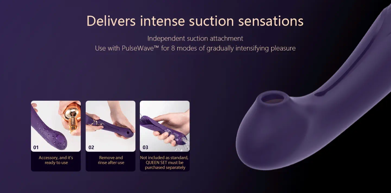 In the box: Queen, suction sleeve attachment, USB charging cable, satin storage pouch, instructions manual, warranty card
